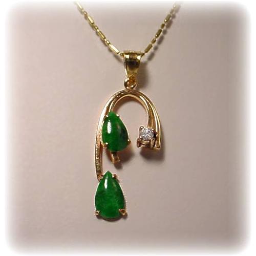 GENUINE JADE AND DIAMONDS MAKE UP THIS PENDANT WHICH IS SET IN SOLID YELLOW GOLD ON AN 16 INCH BALL AND BEAD CHAIN. <P> Our Gold Factory recently purchased the entire inventory from a Jewelry Firm that went out of business. We were able to purchase these items at a huge savings, which we now pass on to you! This is one of many of our one of a kind items. <p> Please note: our merchandise is guaranteed 100% to your satisfaction. If you DON'T LOVE this item, simply return it for a complete refund of your purchase price. Our feedback is 100% positive, so you can shop with confidence, knowing that your satisfaction is our primary concern. <p> *