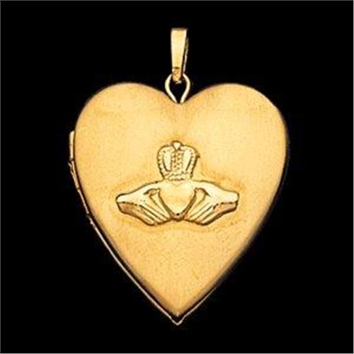 14k Yellow Gold HEART LOCKET featuring the Irish CLADDAGH design of 'Two Hands Holding a Heart'. The Locket measures 21MM across and it opens for photos.