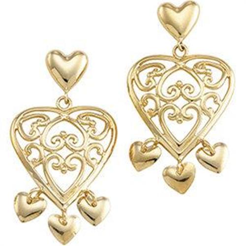 This 'fun' pair of Earrings is 14k Yellow Gold and it features a Gold Heart at the ear (with a Gold post for pierced ears) and a larger Gold Heart dangling with pretty openwork. This pair of HEART SHAPE CHANDELIER EARRINGS measures 1 1/2 inches x 3/4 inch and they are in BRAND NEW condition.