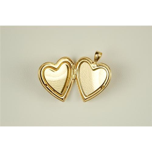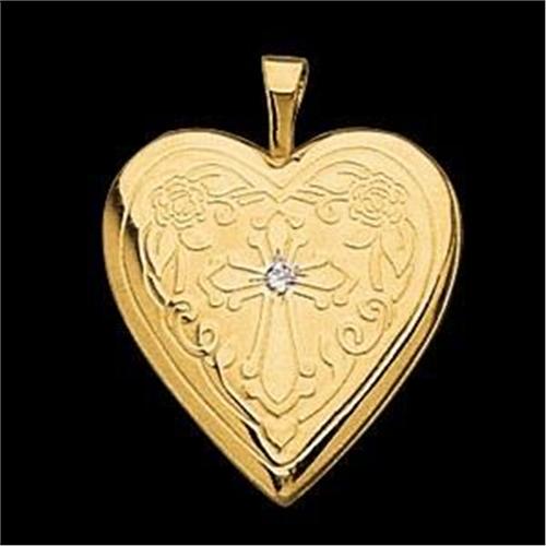 This Antique Style Solid Gold Locket is an Authentic & Accurate copy of a locket Circa 1900 and THIS one is in Mint condition. This 14k Yellow Gold Heartshaped Locket opens to accomodate 2 photographs. The locket measures 3/4" across and 3/4" from top to bottom (without the bail). There is exquisite engraving on the front of the locket highlighted by a Diamond in the center.