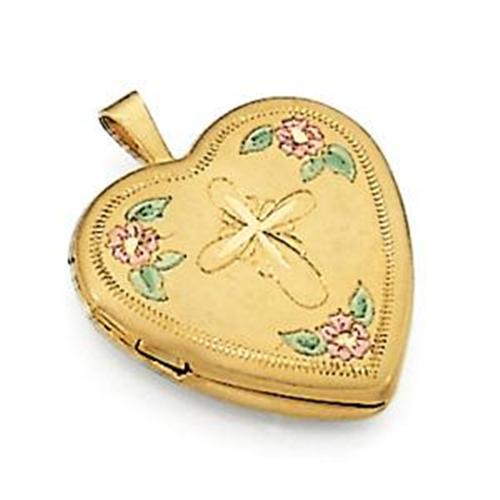 This 14k Yellow Gold HEART shape LOCKET features a beautifully engraved Gold CROSS with Pink and Green Gold flowers. The Locket measures 3/4 inch across and it opens to hold two photos.