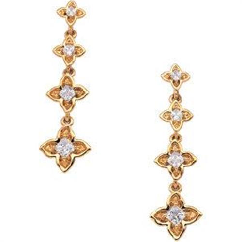 This pair of Earrings are referred to as 'JOURNEY DIAMOND EARRINGS'. They are 14k Yellow Gold and each earring is set with 4 PRINCESS CUT DIAMONDS. The DIAMOND TOTAL WEIGHT = .75 CARATS! They are post style backs for pierced ears.