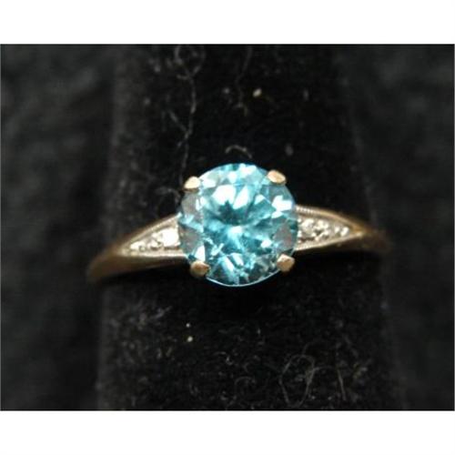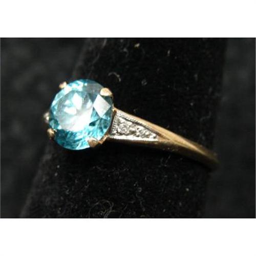 14K GOLD LADIES’ AQUAMARINE RING. Has aquamarine solitaire with very small diamonds on both sides of stone.