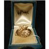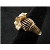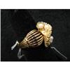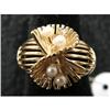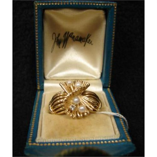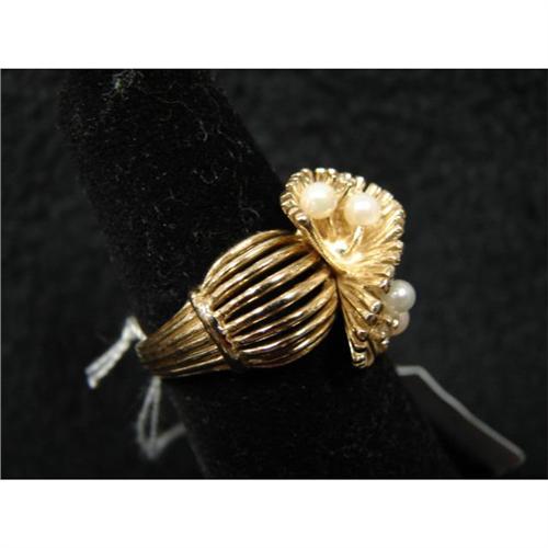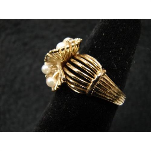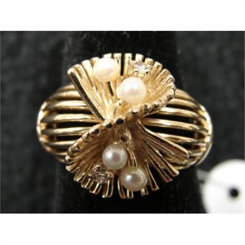 14K GOLD LADIES’ DIAMOND & PEARL COCKTAIL RING. Swirled gold bar design with 4 small pearls and 2 small diamonds. Has John Wanamaker case.
