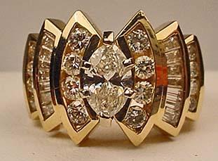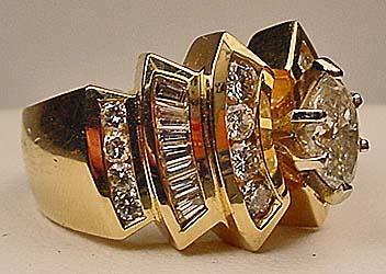 14K GOLD LADIES DIAMOND RING - SZ. 7 - Poss. Vintage. 1 Large Diamond Center Stone (believe it is over 1 CT.) 16 Round Brilliant Cut Diamonds Adjacent to Center Stone. 14 Baguette Cut Diamonds (7 on each side of Center stone). Consignors states 2+ CT. TW in Diamonds