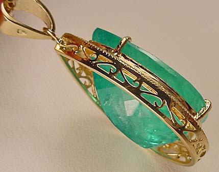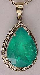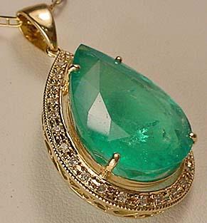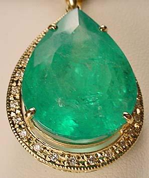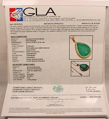14K GOLD LADIES EMERALD AND DIAMOND PENDANT W/ CHAIN - Comes w/ GLA Appraisal of $59,959.00. 1 pear cut Emerald center stone. 27 round full cut diamonds. Emerald 27.56ct., Diamonds 0.32ct., Total Weight 13.80 grams.