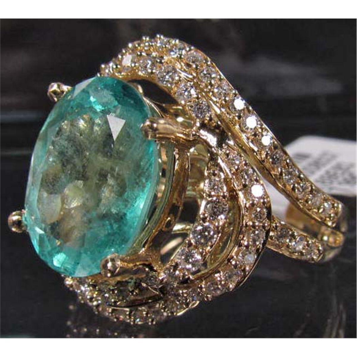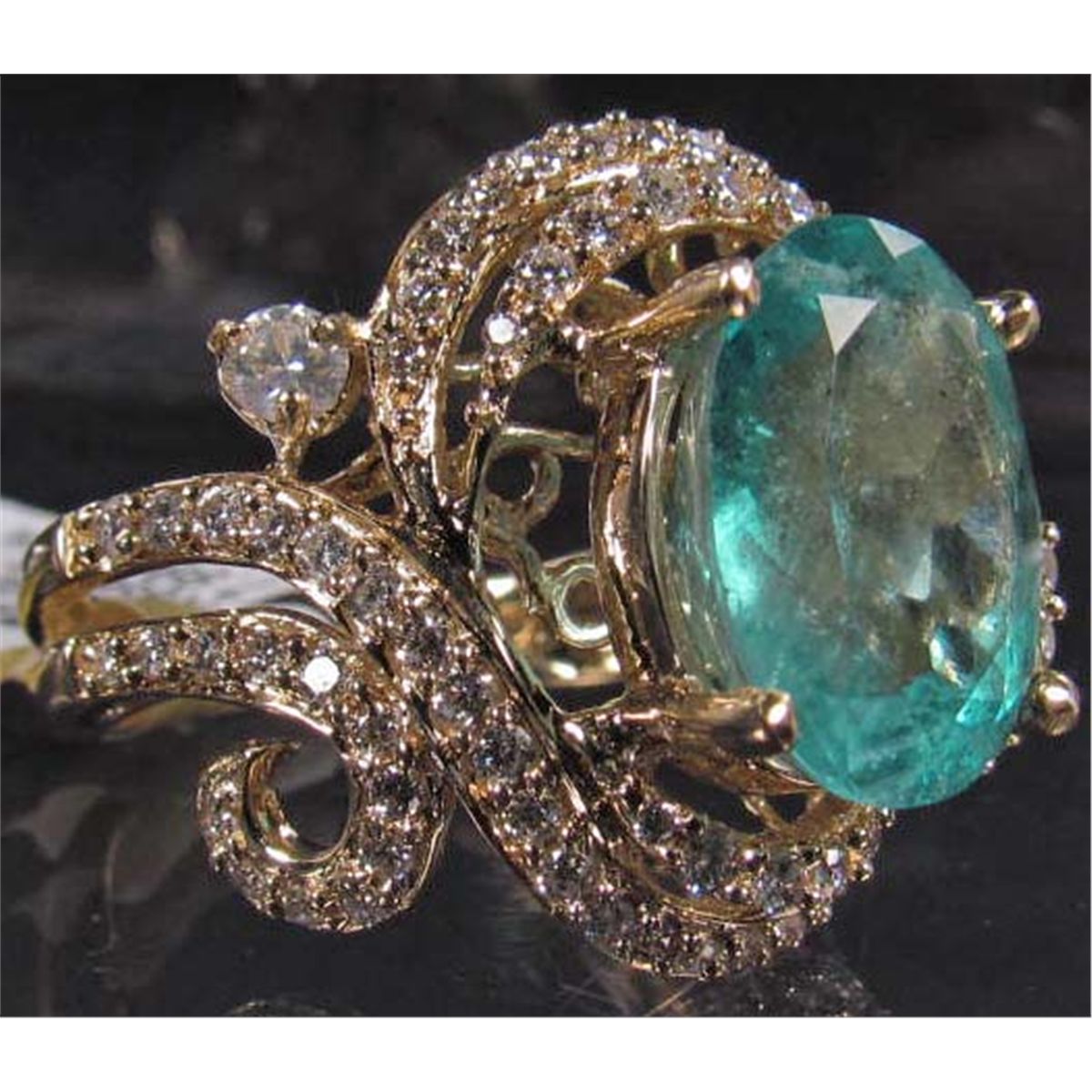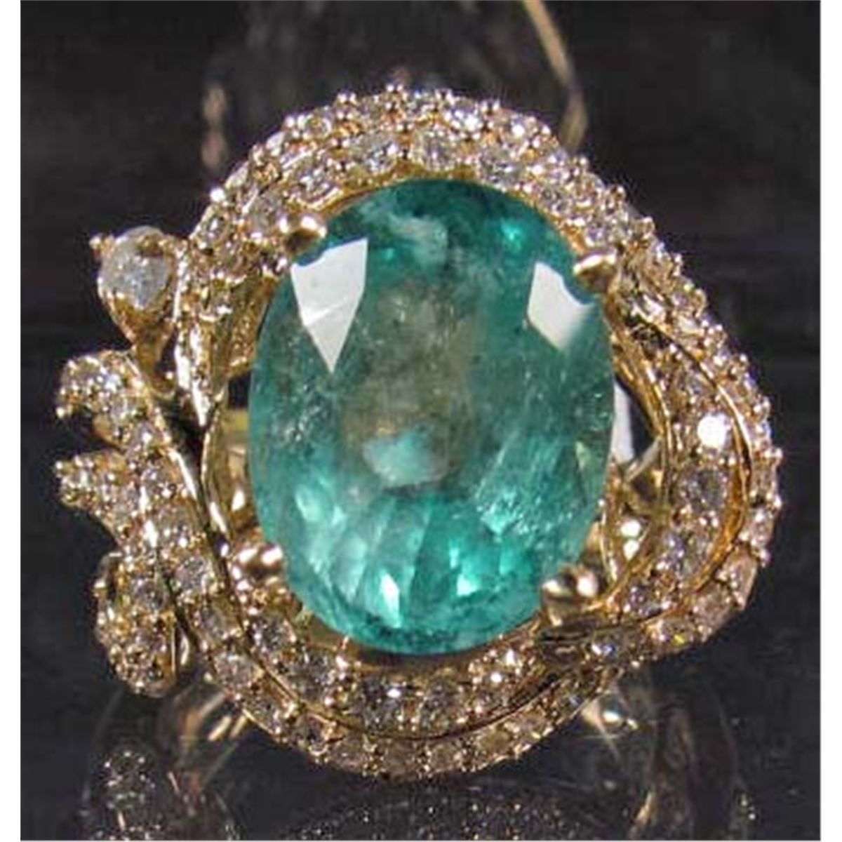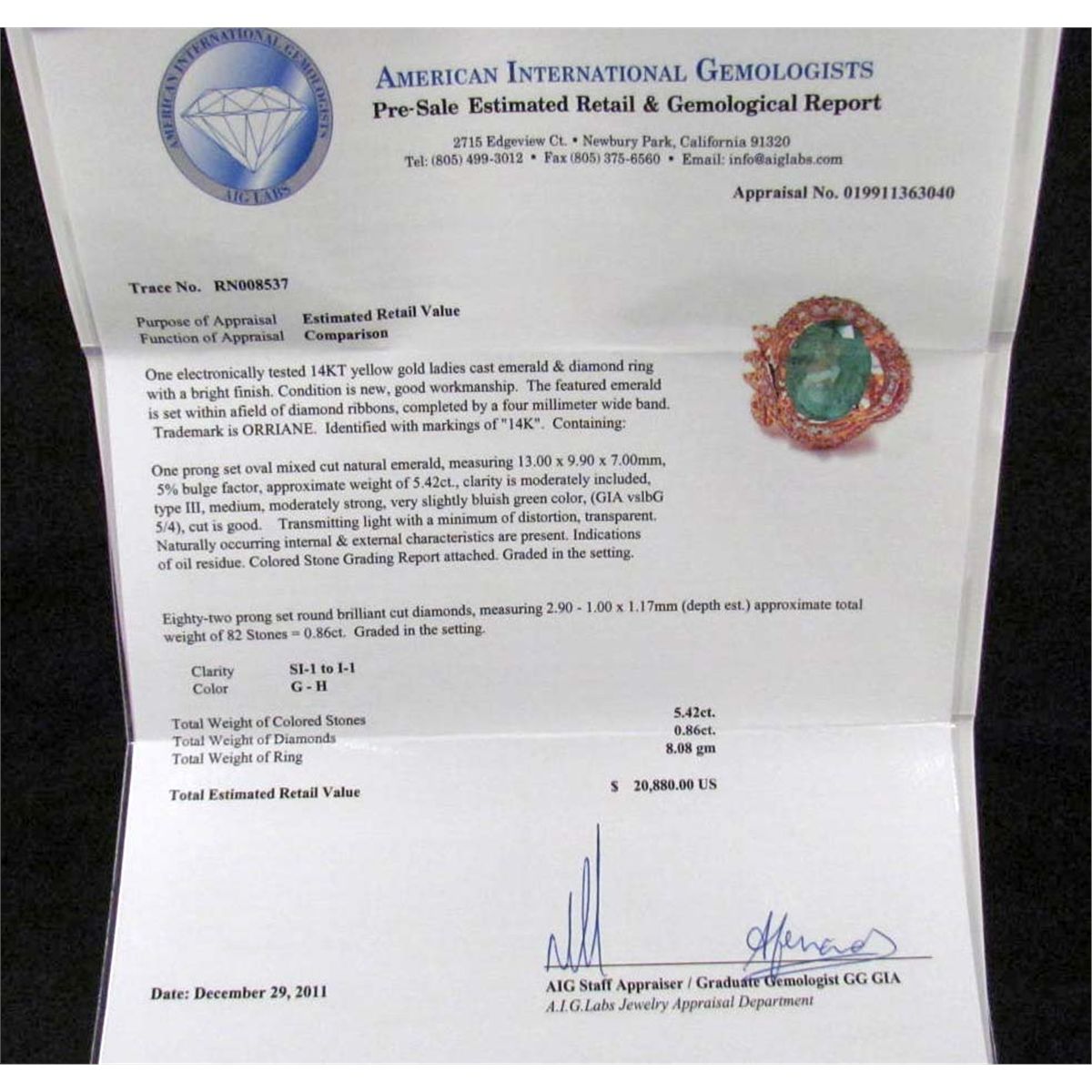 Comes w/ AIG Appraisal of $20,880.00. One prong set oval mixed cut Emerald center stone. 82 prong set round brilliant cut Diamonds. Emerald 5.42 cts, Diamonds 0.86 cts, Total Weight 8.08 grams.