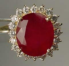14K GOLD LADIES RUBY AND DIAMOND RING - Comes with AIG appraisal of $9,830.00. One prong set oval mixed cut ruby. 20 prong set round brilliant cut diamonds. Ruby 14.19 CT, Diamonds 1.26 CT, Total Weight 9.77 GM