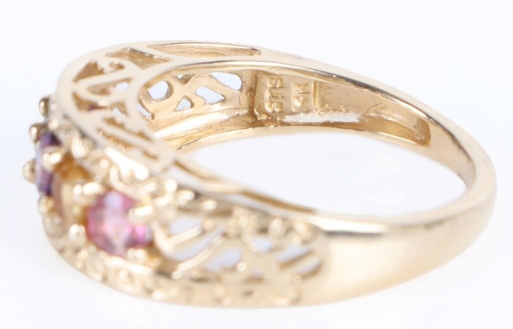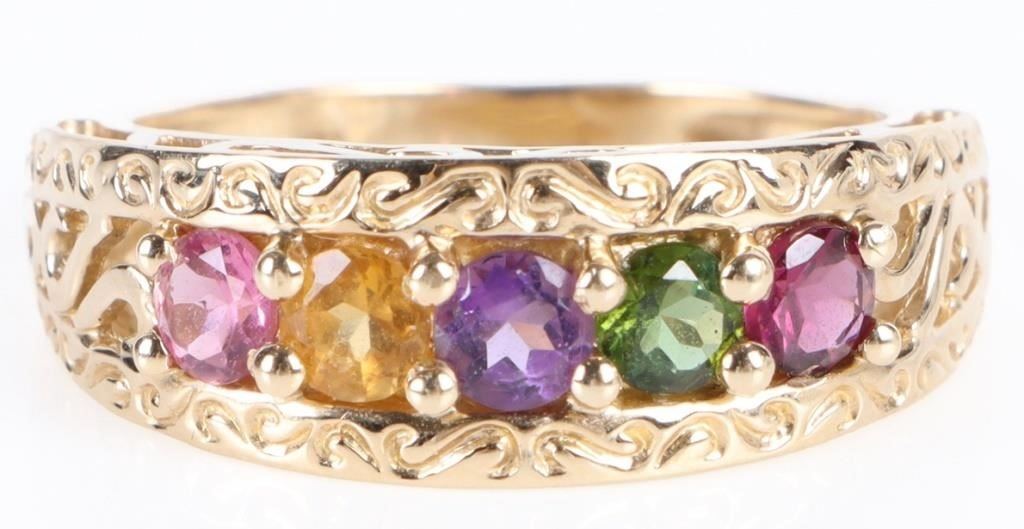 14K Gold Multi-Gemstone Modern Filigree Design Ring. To feature Aquamarine, Spinel, Topaz, Emerald, & amp; Amethyst round cut gemstones in that order.