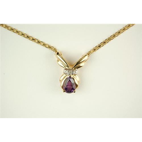 This beautiful 14k Yellow Gold Necklace features a Pearshaped AMETHYST = ONE CARAT with 3 DIAMONDS set above it as accent. This Amethyst and Diamond Necklace is 16 inches in length.