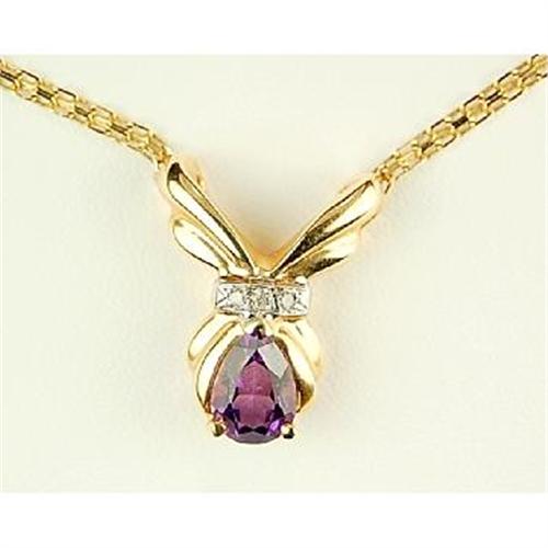 This beautiful 14k Yellow Gold Necklace features a Pearshaped AMETHYST = ONE CARAT with 3 DIAMONDS set above it as accent. This Amethyst and Diamond Necklace is 16 inches in length.