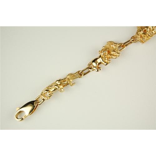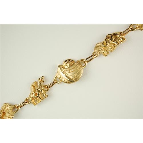 14k Yellow Gold Bracelet by ARDIAN features NOAH'S ARK in SOLID GOLD. There is a Gold Ark, and pairs of animals including Giraffes, Elephants, Lions, Zebras and Alligators! This Bracelet is 7 inches in length and it is 1/2" at its' widest. This is a Vintage Bracelet from the 1970s.