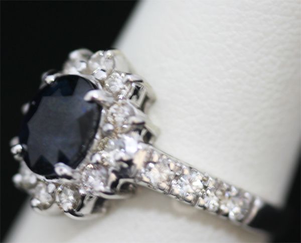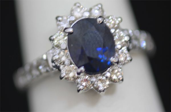 14K GOLD OVAL BLUE SAPPHIRE AND DIAMOND RING **|**|** 14K GOLD OVAL BLUE SAPPHIRE AND DIAMOND RING; MAINSTONE 2.56 CTW; DIAMOND 1.0 CTW; GOLD 14K WHITE 4.5 GRAMS ; MSRP: $0