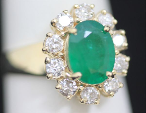 14K GOLD OVAL EMERALD AND DIAMOND RING **|**|** 14K GOLD OVAL EMERALD AND DIAMOND RING; MAINSTONE 2.2 CTW; DIAMOND 1.0 CTW; GOLD 14K YELLOW 6.2 GRAMS ; MSRP: $0