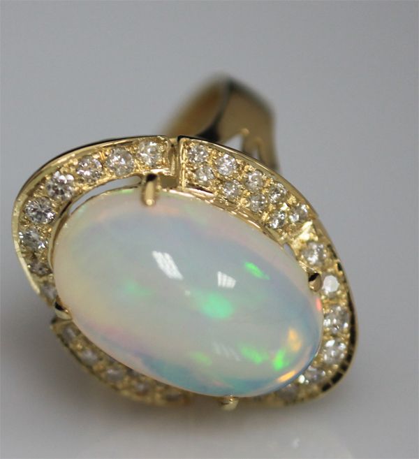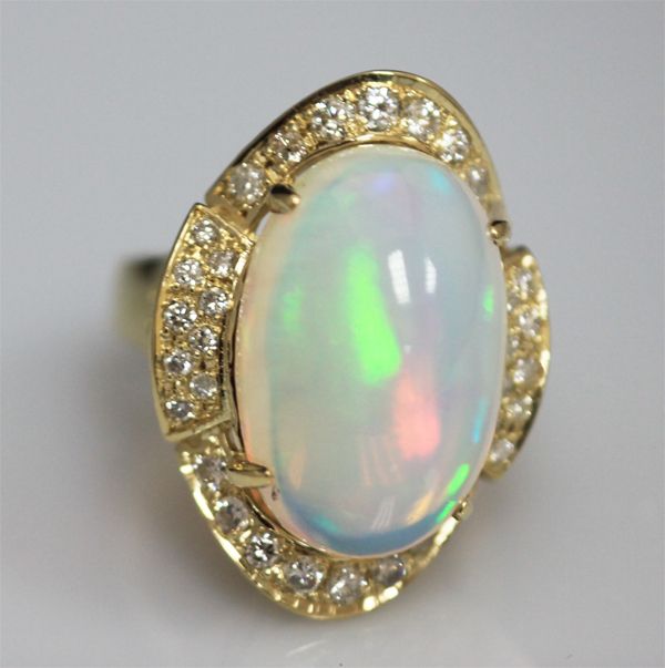 14K GOLD OVAL OPAL AND DIAMOND RING **|**|** 14K GOLD OVAL OPAL AND DIAMOND RING; MAINSTONE 11.9 CTW; DIAMOND 0.85 CTW; GOLD 14K YELLOW 8.0 GRAMS ; MSRP: $0