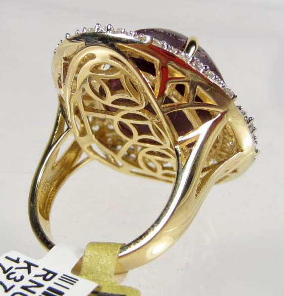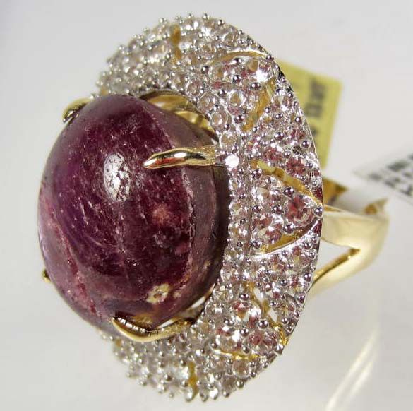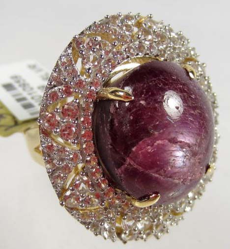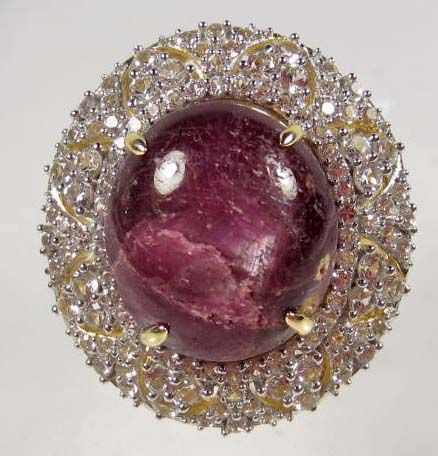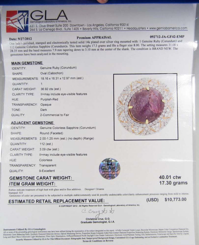 Comes w/ GLA Appraisal of $10,773.00. One oval Ruby center stone. 112 round colorless Sapphires. Ruby 36.92 cts, Sapphires 3.09 cts, Total Weight 17.30 grams.