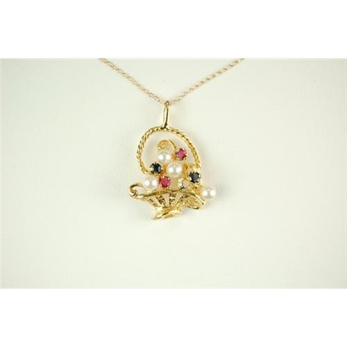14k Yellow Gold Pendant featuring a 'Basket of Flowers' set with Pearls, Rubies, and Sapphires. This pretty Basket measures 1 inch and it is suspended from a 16 inch Gold Chain.