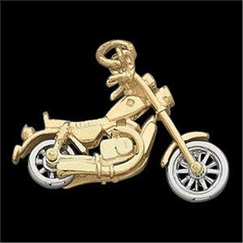 14k Two Toned Gold Charm of a Motorcycle. The Motorcycle is created in detailed Yellow Gold with the Wheels and Tires in White Gold. This lovely charm measures 18 x 25.75.
