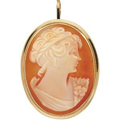 14k Yellow Gold Pendant featuring an Oval CAMEO of a woman looking to her right. She has a beautiful upswept hairdo and a lovely flower at her shoulder. This Cameo is 1 1/4 inches in length and it can be WORN AS BOTH A PENDANT AND AS A PIN.