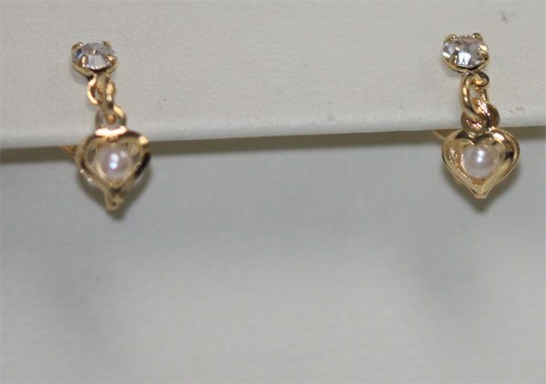 14K GOLD PLATED HEART AND SYNTETIC PEARL EARRINGS **|**|** 14K GOLD PLATED HEART AND SYNTETIC PEARL EARRINGS; METAL BRASS; BRAZILIAN JEWELRY; 14K GOLD PLATED ; MSRP: $0
