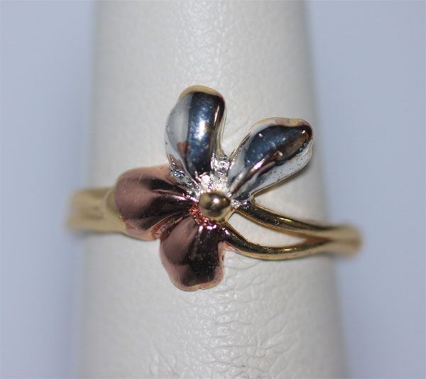 14K GOLD PLATED TRI-COLOR FLOWER LADIES RING **|**|** 14K GOLD PLATED TRI-COLOR FLOWER LADIES RING; METAL BRASS; BRAZILIAN JEWELRY; 14K GOLD PLATED ; MSRP: $0