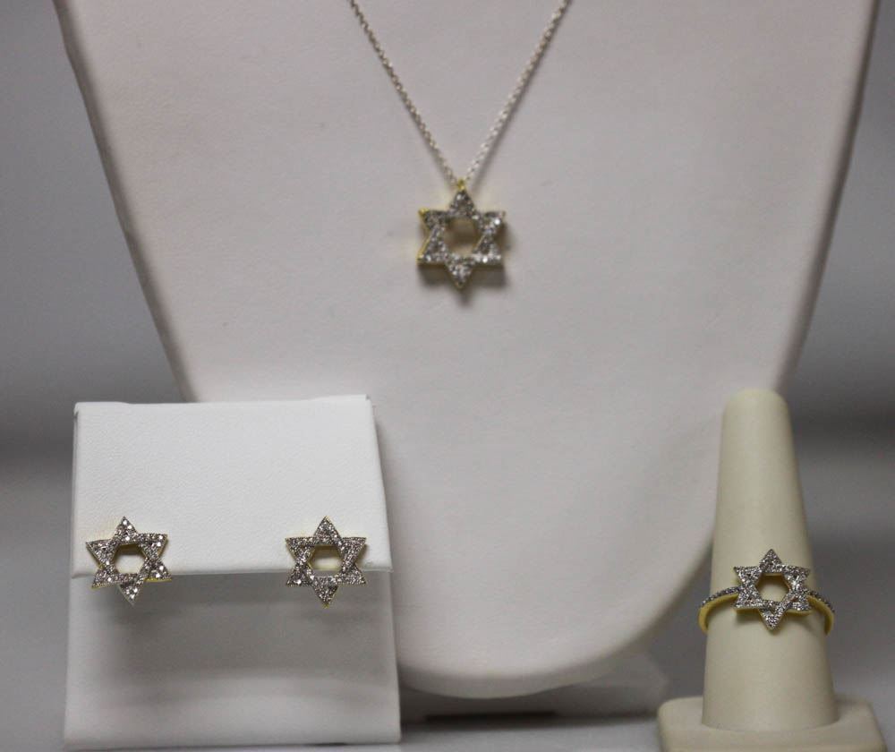 14K GOLD POLISH ON .925 STERLING SILVER STAR OF DAVID S **|**|** 14K GOLD POLISH ON .925 STERLING SILVER STAR OF DAVID RING, STUD EARRINGS, PENDINT W/WHITE CZ