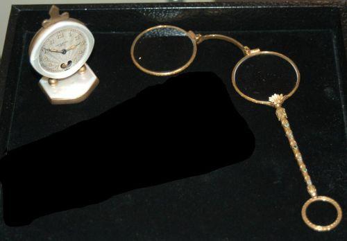 14K GOLD RETRACTING SPECTACLES set with precious stones (some missing) together with SMALL SWISS TRAVEL CLOCK (hairline), PACKING AND SHIPPING (excluding insurance) $20,