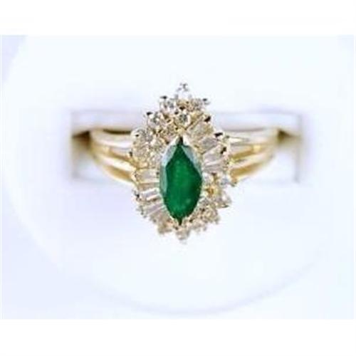 This VERY BEAUTIFUL 14k Yellow Gold Ring features a Marquise Cut EMERALD = .50 CARATS! It is surrounded by 20 Round and 8 Baguette DIAMONDS. The DIAMOND TOTAL WEIGHT = ONE CARAT! This ring is a Size 6 3/4 and it can be resized either larger or smaller.