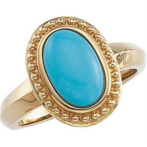14k Yellow Gold Ring featuring an Oval TURQUOISE. The Turquoise measures 11 x 7mm and = 4 CARATS! The Turquoise is surrounded by Antique style Gold beading. This ring is a size 6 and it can be resized either larger or smaller.