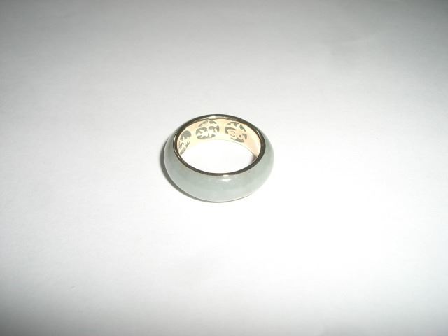 14K GOLD RING WITH BEUATIFUL JADE ETERNITY TOTAL WEIGHT IS 4.42g STAMPED *14K* AND HAS ORIENTAL SYMBOLS INSCRIBED ON THE INSIDE! RING CAME OUT OF SAFE BOX!! ***Coin, Currency & All Items Listed in this auction - Grades, Conditions and Values are not Safe Deposit Coins LLC Responsibilty. Grades, Condition and Values are determined by Consigner(s) & Buyers