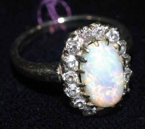 14K GOLD RING WITH OPAL surrounded by diamonds, small size band, condition: excellent, PACKING AND SHIPPING (excluding insurance) $20,
