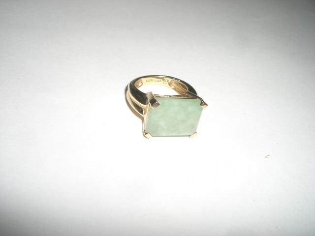 14K GOLD RING WITH VERY BEAUTIFUL LARGE SQUARE CUT JADE CENTER STONE TOTAL WEIGHT IS 7.75g STAMPED *14K*!! RING CAME OUT OF SAFE!! ***Coin, Currency & All Items Listed in this auction - Grades, Conditions and Values are not Safe Deposit Coins LLC Responsibilty. Grades, Condition and Values are determined by Consigner(s) & Buyers