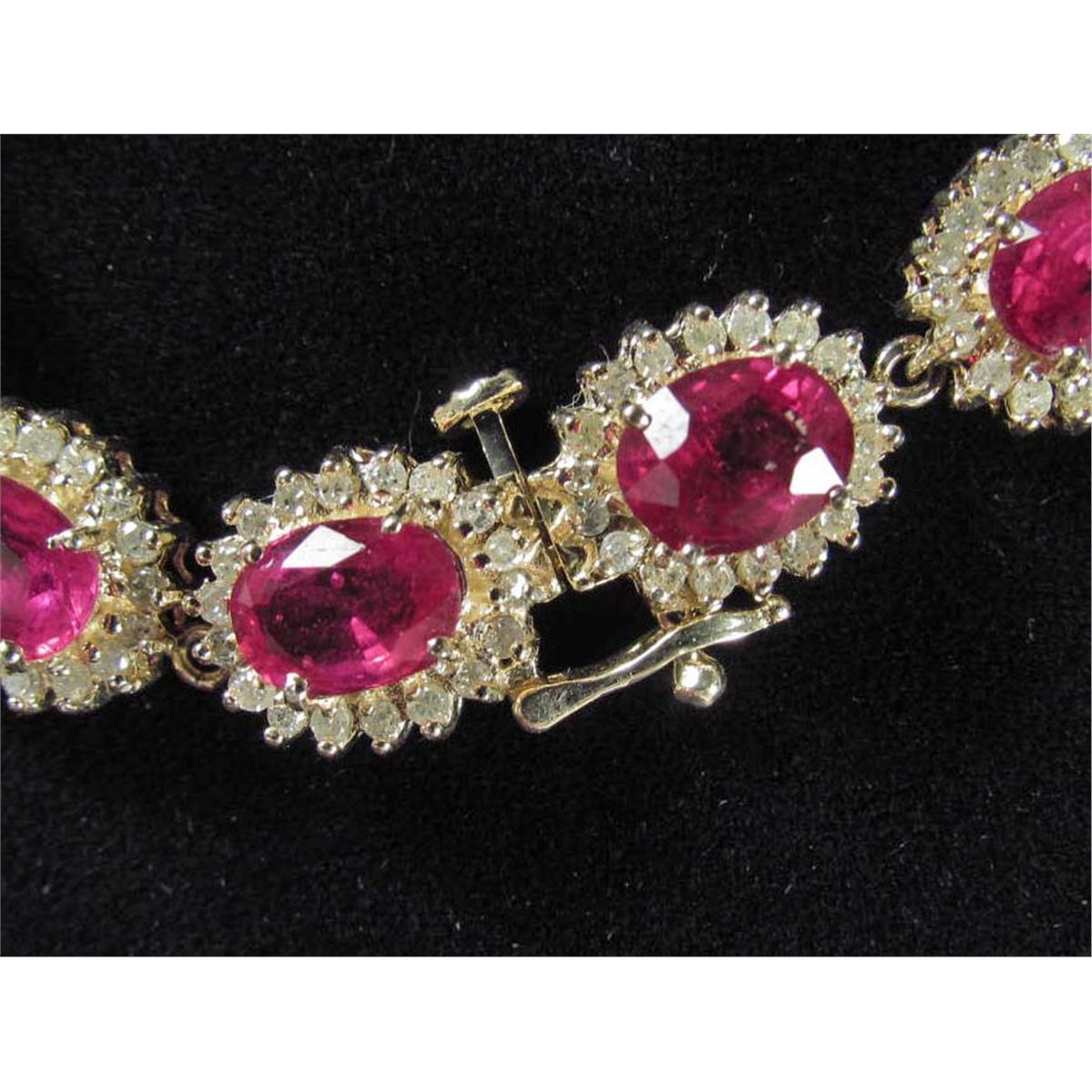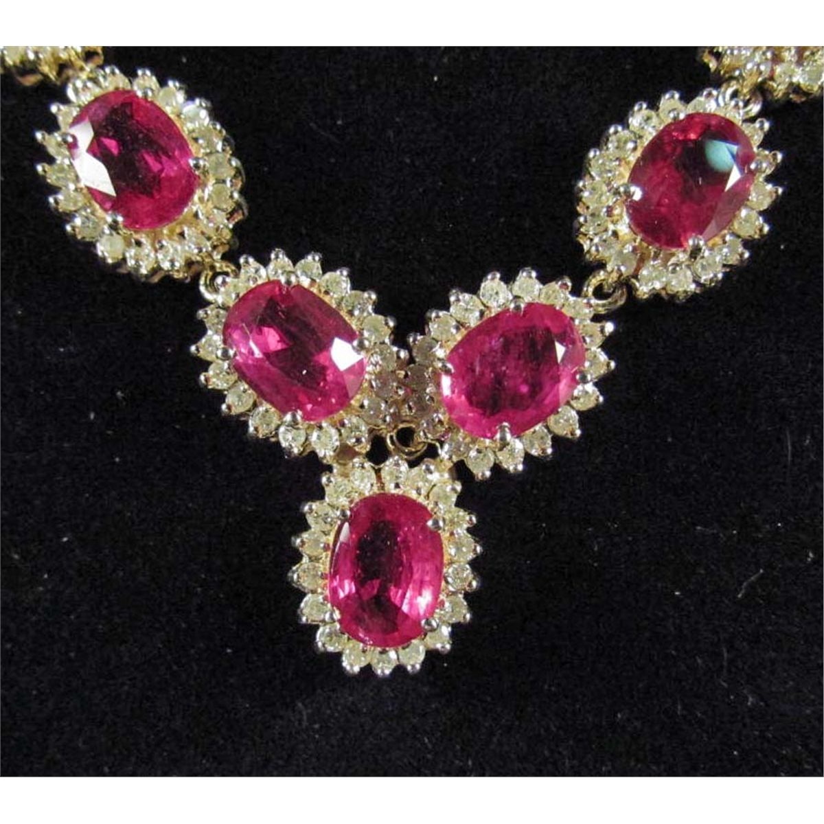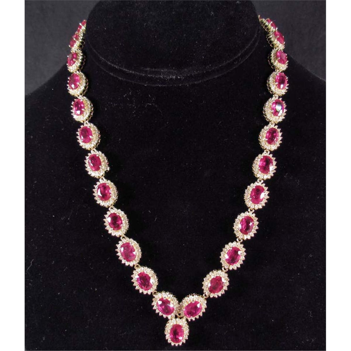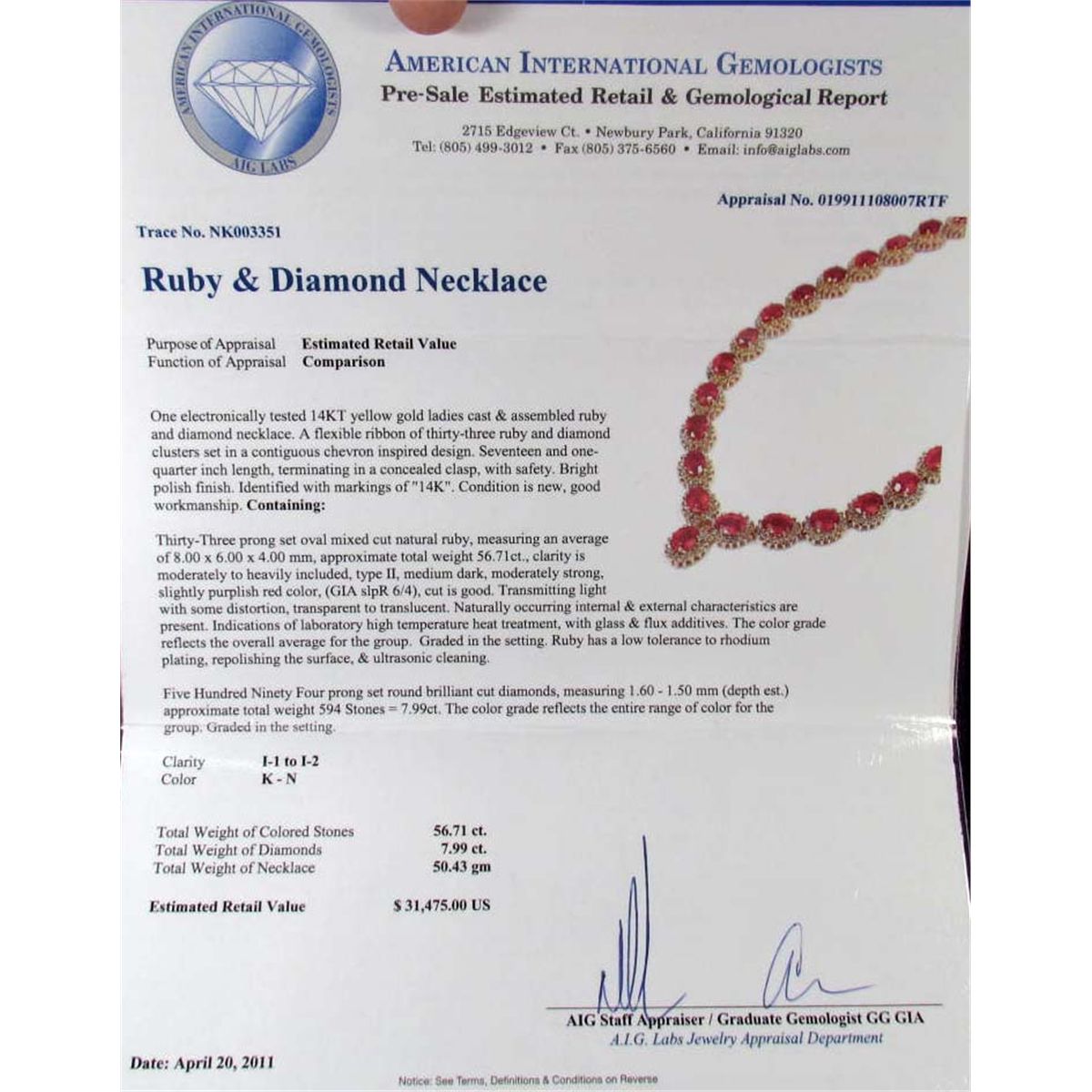 Comes w/ AIG Appraisal of $31,475.00. 33 prong set oval mixed cut Rubies. 594 prong set round brilliant cut Diamonds. Rubies 56..71 cts, Diamonds 7.99 cts, Total Weight 50.43 grams.