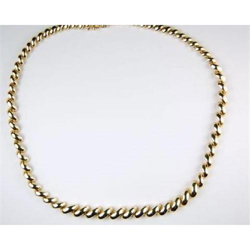 This 14k Yellow GOLD NECKLACE features a GRADUATED SAN MARCO LINK. The widest link, in the front center of the Necklace, is 8MM Wide and the narrowest link near the clasp, is 5MM Wide. This VERY BEAUTIFUL SAN MARCO NECKLACE is 17" in length and it has a very sturdy clasp.