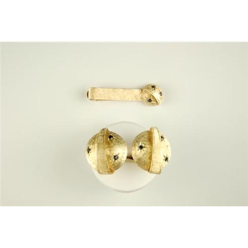 Deco Set of 14k Yellow Gold Cufflinks and Tie Bar. They are 'deco style' featuring a florentined round dome with a swirl over the top, and set with 3 Sapphires. The matching 14k Gold Tie Bar features the same design.