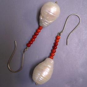 14K WHITE GOLD SOUTH SEA PEAR AND ITALIAN CORAL EARRINGS. THE PEARL MEASURES 11 MM DIAMETER, BAROQUE. OVERALL DIMENSION: 31x11 MM