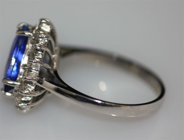 14K GOLD TRILLION CUT TANZANITE AND DIAMOND RING **|**|** 14K GOLD TRILLION CUT TANZANITE AND DIAMOND RING; MAINSTONE WEIGHT 4.1 CTW; DIAMOND 0.75 CTW; GOLD 5.0 GRAMS/ 14K WHITE GOLD ; MSRP: $0