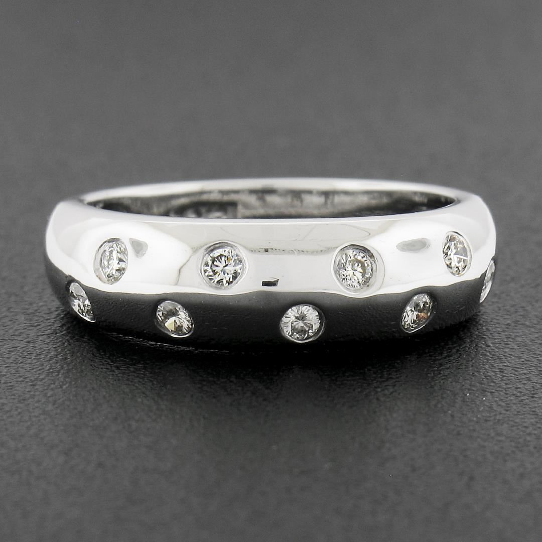 A solid 14k white gold band ring, with 9 round cut natural diamonds (H - VS1 ; 0.18ctw). The ring is size 5.0, weighs a total of 3.8 grams, and measures 5.9mm wide.