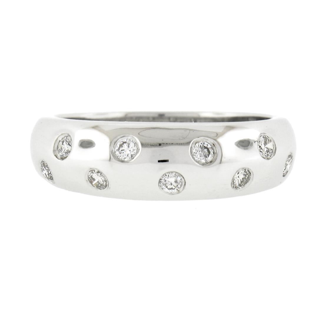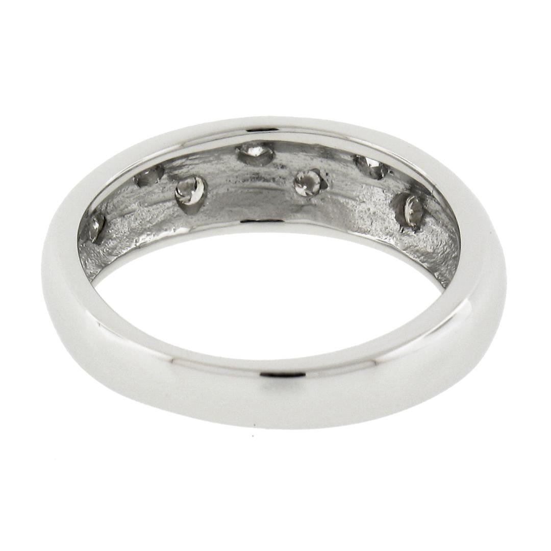 A solid 14k white gold band ring, with 9 round cut natural diamonds (H - VS1 ; 0.18ctw). The ring is size 5.0, weighs a total of 3.8 grams, and measures 5.9mm wide.