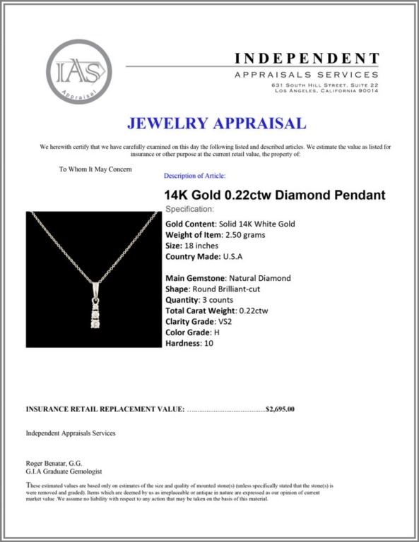 Regarding Appraised Jewelry and Loose Stones - Auctionfarm sends them out to a third party for Retail Replacement Value Appraisals, which are the most common. These types of evaluations are written for insurance needs. This would be the cost to replace the jewelry with an item of equal quality and kind, considered to be the current market price or the replacement value. This type of appraisal is done to protect you in the event of damage or loss of a valuable item. Our appraisals are conducted by independent 3rd Party appraisal firms that utilizes Certified GIA Gemologist. Appraisals should be used for verification of gemstone and/or metal weight, size, and grade only, not actual value. Appraisal value should be considered for insurance purposes only, not actual value, as price varies greatly from retail locations thru out the world. Items should not be purchased with the expectation to resell for appraisal price, or for profit.