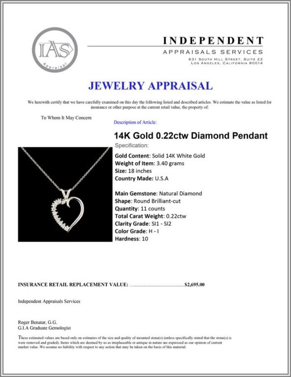 Regarding Appraised Jewelry and Loose Stones - Auctionfarm sends them out to a third party for Retail Replacement Value Appraisals, which are the most common. These types of evaluations are written for insurance needs. This would be the cost to replace the jewelry with an item of equal quality and kind, considered to be the current market price or the replacement value. This type of appraisal is done to protect you in the event of damage or loss of a valuable item. Our appraisals are conducted by independent 3rd Party appraisal firms that utilizes Certified GIA Gemologist. Appraisals should be used for verification of gemstone and/or metal weight, size, and grade only, not actual value. Appraisal value should be considered for insurance purposes only, not actual value, as price varies greatly from retail locations thru out the world. Items should not be purchased with the expectation to resell for appraisal price, or for profit.