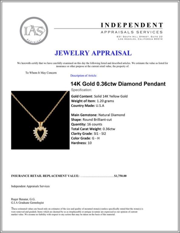Regarding Appraised Jewelry and Loose Stones - Auctionfarm sends them out to a third party for Retail Replacement Value Appraisals, which are the most common. These types of evaluations are written for insurance needs. This would be the cost to replace the jewelry with an item of equal quality and kind, considered to be the current market price or the replacement value. This type of appraisal is done to protect you in the event of damage or loss of a valuable item. Our appraisals are conducted by independent 3rd Party appraisal firms that utilizes Certified GIA Gemologist. Appraisals should be used for verification of gemstone and/or metal weight, size, and grade only, not actual value. Appraisal value should be considered for insurance purposes only, not actual value, as price varies greatly from retail locations thru out the world. Items should not be purchased with the expectation to resell for appraisal price, or for profit.