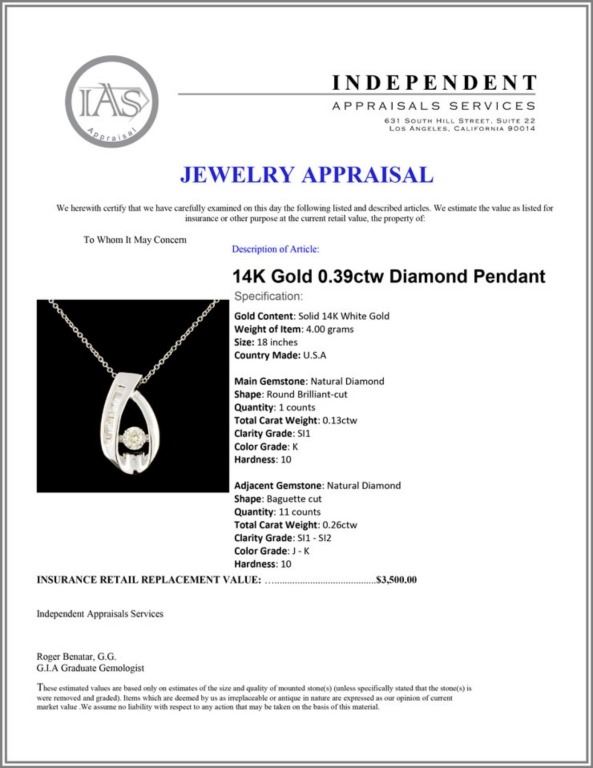 Regarding Appraised Jewelry and Loose Stones - Auctionfarm sends them out to a third party for Retail Replacement Value Appraisals, which are the most common. These types of evaluations are written for insurance needs. This would be the cost to replace the jewelry with an item of equal quality and kind, considered to be the current market price or the replacement value. This type of appraisal is done to protect you in the event of damage or loss of a valuable item. Our appraisals are conducted by independent 3rd Party appraisal firms that utilizes Certified GIA Gemologist. Appraisals should be used for verification of gemstone and/or metal weight, size, and grade only, not actual value. Appraisal value should be considered for insurance purposes only, not actual value, as price varies greatly from retail locations thru out the world. Items should not be purchased with the expectation to resell for appraisal price, or for profit.