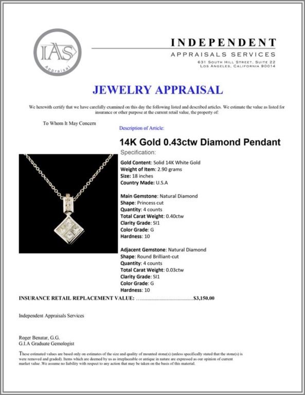 Regarding Appraised Jewelry and Loose Stones - Auctionfarm sends them out to a third party for Retail Replacement Value Appraisals, which are the most common. These types of evaluations are written for insurance needs. This would be the cost to replace the jewelry with an item of equal quality and kind, considered to be the current market price or the replacement value. This type of appraisal is done to protect you in the event of damage or loss of a valuable item. Our appraisals are conducted by independent 3rd Party appraisal firms that utilizes Certified GIA Gemologist. Appraisals should be used for verification of gemstone and/or metal weight, size, and grade only, not actual value. Appraisal value should be considered for insurance purposes only, not actual value, as price varies greatly from retail locations thru out the world. Items should not be purchased with the expectation to resell for appraisal price, or for profit.