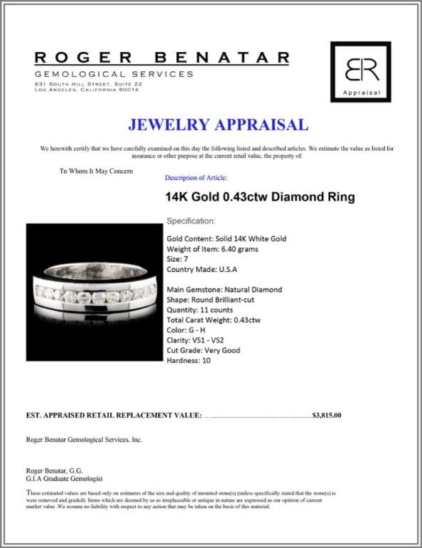 Estimated Retail Replacement Value: $3,815.00Ref: WAG2180Item no.: EJT002Specification:Gold Content: Solid 14K White Gold Weight of Item: 6.40 gramsSize: 7Country Made: U.S.A Main Gemstone: Natural Diamond Shape: Round Brilliant-cutQuantity: 11 countsTotal Carat Weight: 0.43ctwColor: G - HClarity: VS1 - VS2Cut Grade: Very GoodHardness: 10 Great Condition - Shipping notes: We ship 4-10 Business day after the clearance of payment. Tracking numbers are emailed once the package(s) are shipped. Most shipments are sent by FEDEX Priority, UPS Priority, or US PRIORITY MAIL INSURED