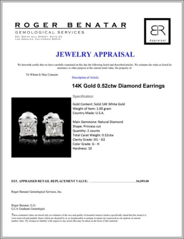 Regarding Appraised Jewelry and Loose Stones - Auctionfarm sends them out to a third party for Retail Replacement Value Appraisals, which are the most common. These types of evaluations are written for insurance needs. This would be the cost to replace the jewelry with an item of equal quality and kind, considered to be the current market price or the replacement value. This type of appraisal is done to protect you in the event of damage or loss of a valuable item. Our appraisals are conducted by independent 3rd Party appraisal firms that utilizes Certified GIA Gemologist. Appraisals should be used for verification of gemstone and/or metal weight, size, and grade only, not actual value. Appraisal value should be considered for insurance purposes only, not actual value, as price varies greatly from retail locations thru out the world. Items should not be purchased with the expectation to resell for appraisal price, or for profit.