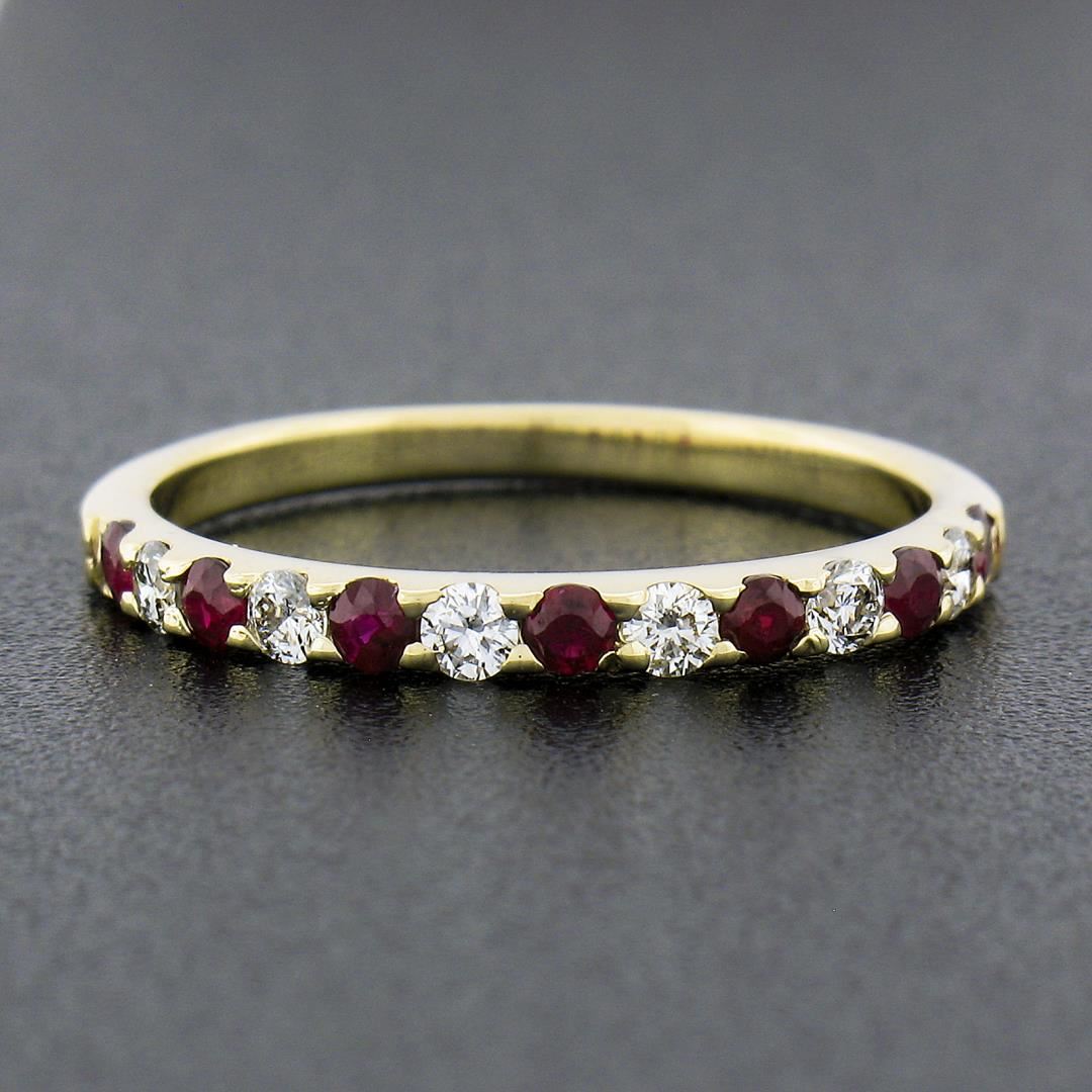 A solid 14k yellow gold band ring, with 7 round cut natural rubies (0.35ctw ), alternated with 6 round cut natural diamonds (F/G - VS2/SI2 ; 0.18ctw ). The ring is size 6.5, weighs a total of 1.72 grams, and measures 2.1mm wide.