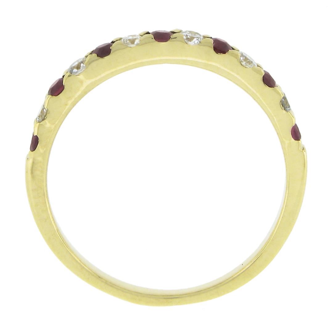 A solid 14k yellow gold band ring, with 7 round cut natural rubies (0.35ctw ), alternated with 6 round cut natural diamonds (F/G - VS2/SI2 ; 0.18ctw ). The ring is size 6.5, weighs a total of 1.72 grams, and measures 2.1mm wide.
