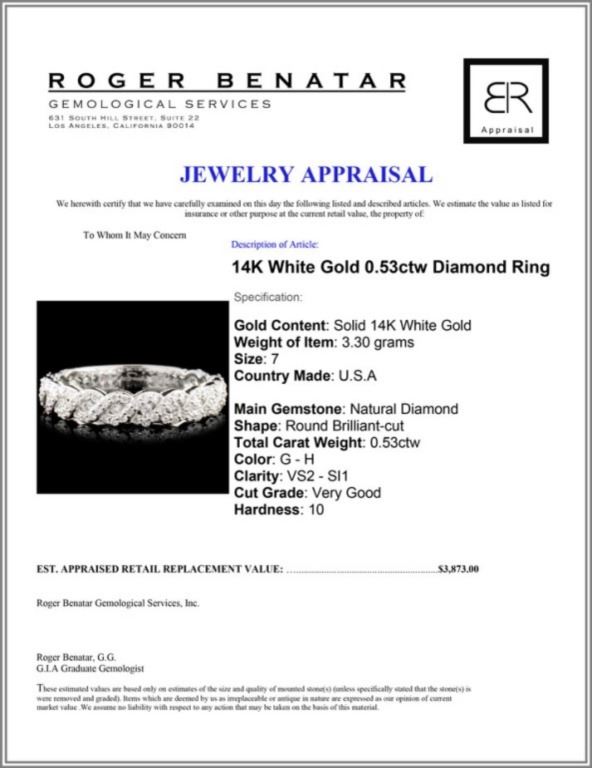 Regarding Appraised Jewelry and Loose Stones - Auctionfarm sends them out to a third party for Retail Replacement Value Appraisals, which are the most common. These types of evaluations are written for insurance needs. This would be the cost to replace the jewelry with an item of equal quality and kind, considered to be the current market price or the replacement value. This type of appraisal is done to protect you in the event of damage or loss of a valuable item. Our appraisals are conducted by independent 3rd Party appraisal firms that utilizes Certified GIA Gemologist. Appraisals should be used for verification of gemstone and/or metal weight, size, and grade only, not actual value. Appraisal value should be considered for insurance purposes only, not actual value, as price varies greatly from retail locations thru out the world. Items should not be purchased with the expectation to resell for appraisal price, or for profit.