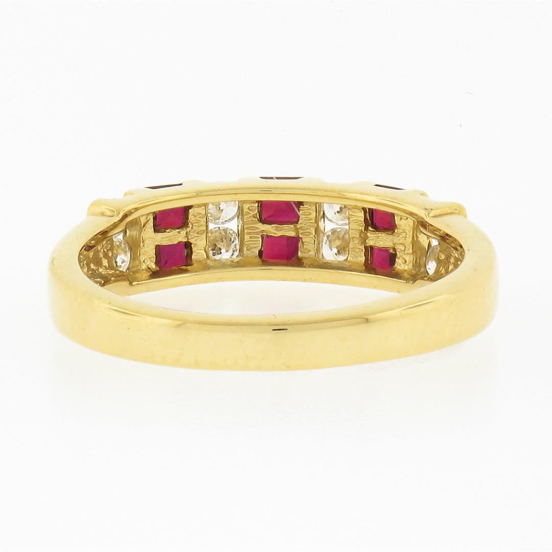 A solid 14k yellow gold band ring, alternated 6 square step cut natural runbies (0.30ctw ), and 8 round cut natural diamonds (F/G - VS1/VS2 ; 0.24ctw). The ring is size 5.5, weighs a total of 2.85 grams, and measures 4.45mm wide.